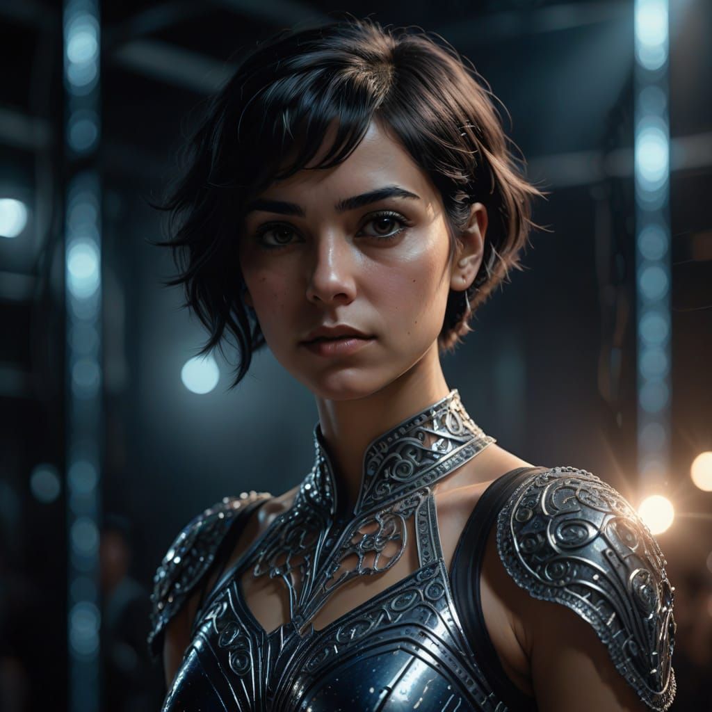 A hyperrealistic digital painting captures a 30-year-old Syrian woman on stage, wearing a cybernetic choker. Moody blues and silvers enhance the dramatic, cinematic atmosphere.