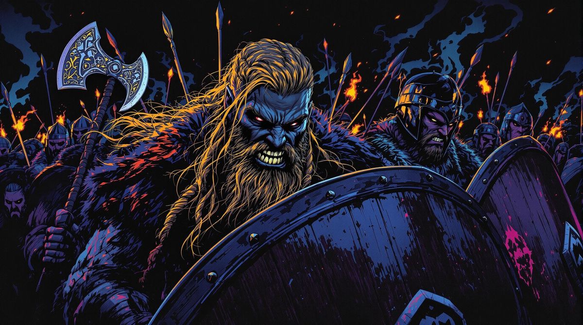 This image showcases Viking warriors in a dramatic blacklight poster style, featuring stark contrasts and ultraviolet-sensitive colors. The scene blends Art Nouveau lithography with dark fantasy elements, depicting a fierce shield wall under attack.