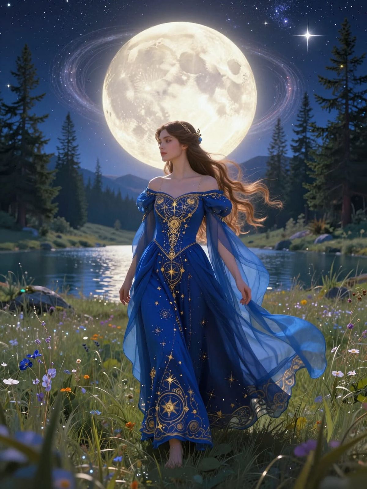 A digital illustration of a celestial princess in a cobalt gown amidst a magical starlit meadow with a glowing moon. Inspired by Art Nouveau and luminous lighting styles.