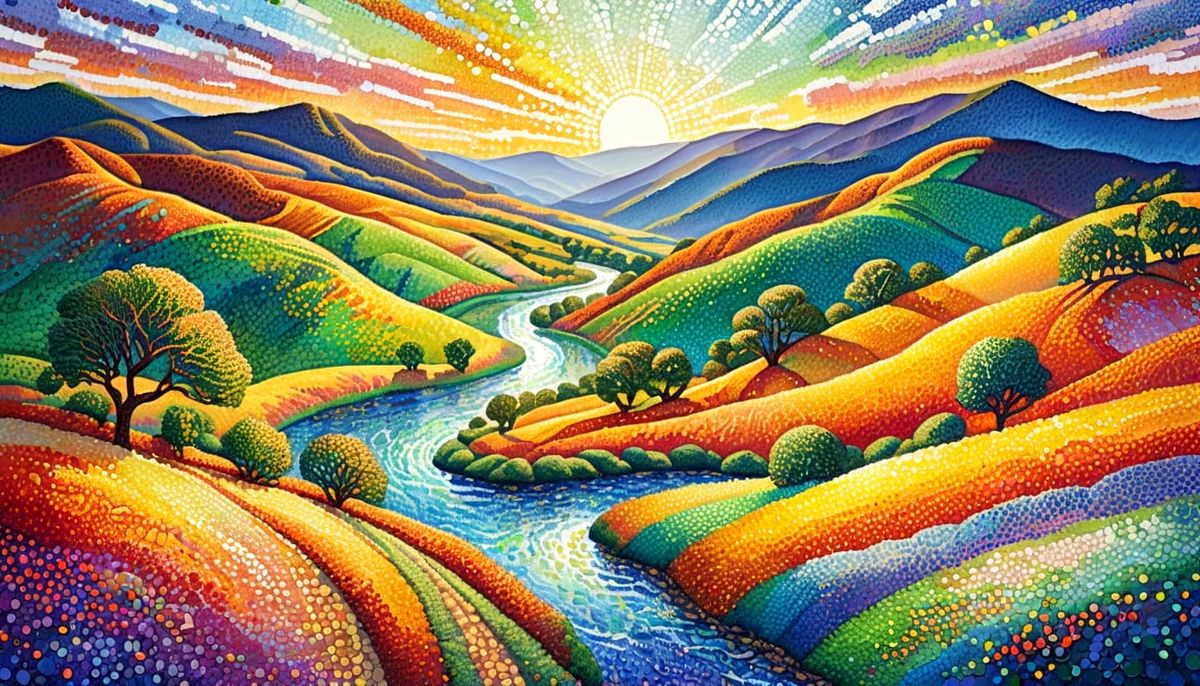 This image showcases the distinct dot-based technique of pointillism art. Explore the unique visual texture created by applying small, distinct dots of color in patterns.