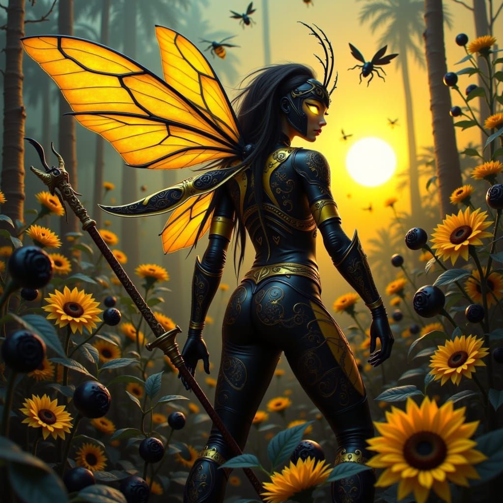 A striking picture of a bumblebee battle queen in iridescent armor. The digital art features filigree wings, glowing eyes, and a gothic weapon, set amongst black roses and sunflowers in a dark fantasy aesthetic.