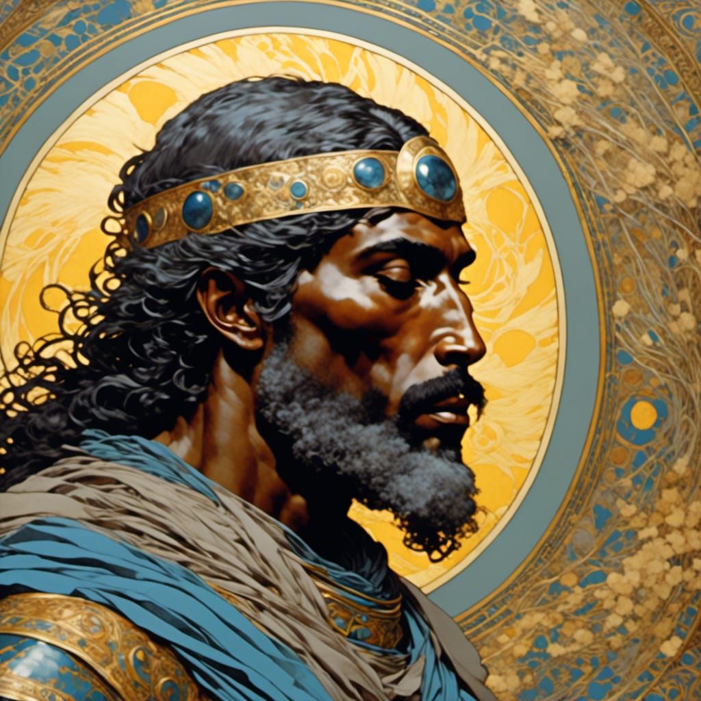 A striking portrait of a dark-skinned warrior with face paint in a swamp. The image evokes medieval iconography and pre-raphaelite art with lush colors in a fantastical scene.