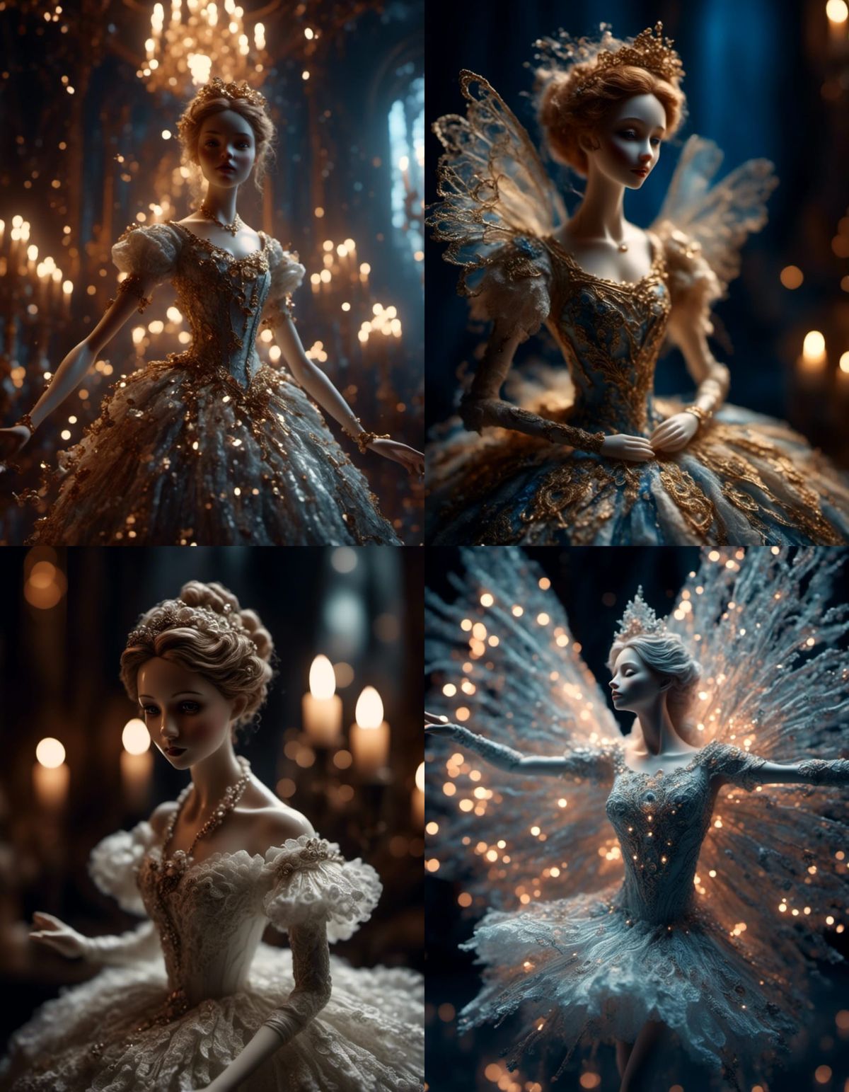 This image shows a porcelain ballet dancer doll with hyperrealistic details. The rendering captures a cinematic, intricately detailed 3D game aesthetic with dynamic lighting and perfect composition.