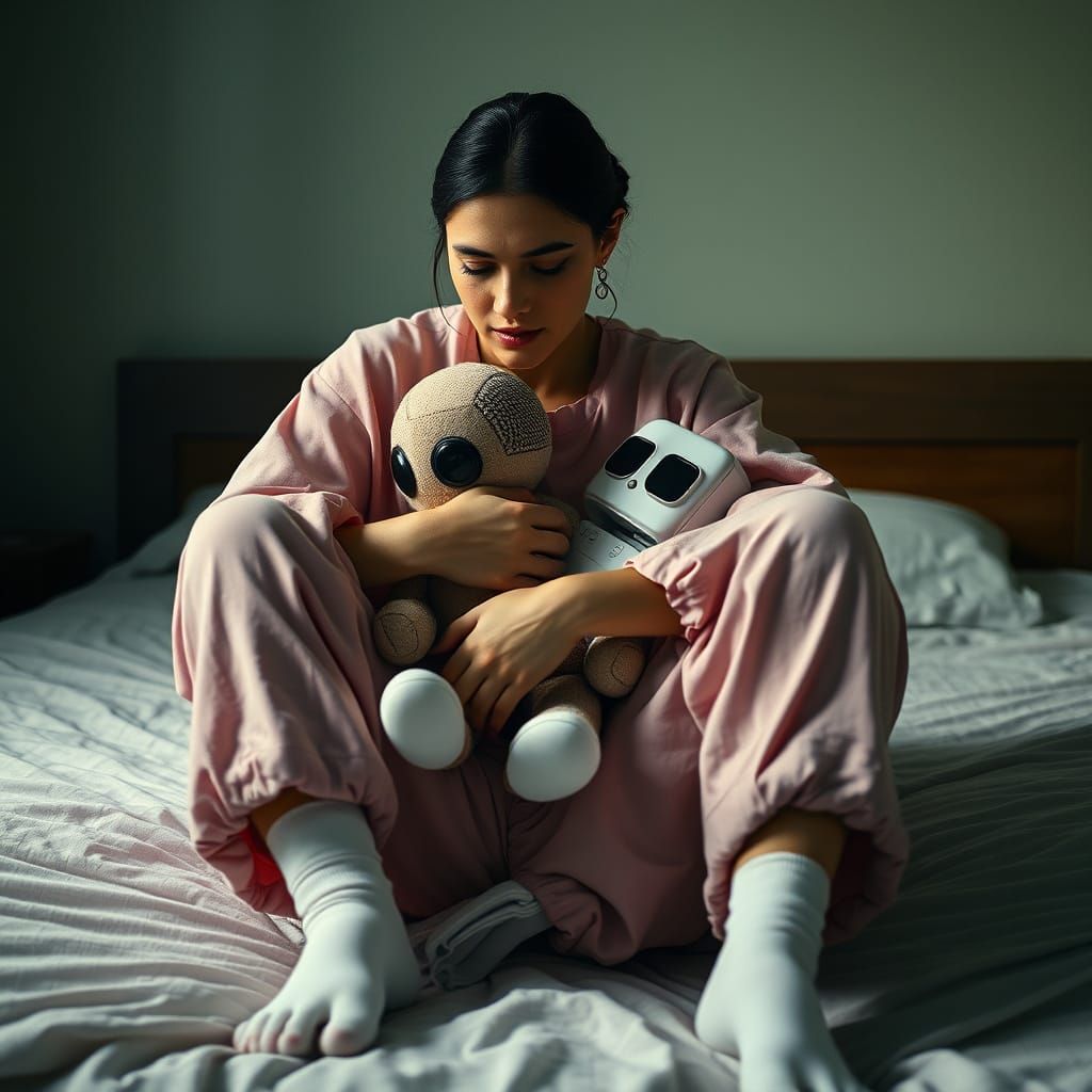 This image is a poignant portrayal of a young woman lost in a sterile environment, cradling a faded AI plush toy, set against a striking chiaroscuro backdrop, with a nostalgic undertone.