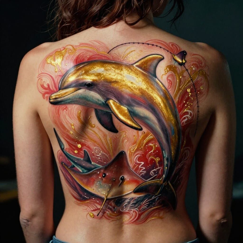 This image displays a realistic tattoo design on a woman's back, featuring a dolphin, shark, and stingray. Rendered with cinematic realism and dramatic lighting, it showcases intricate details in gold and red.