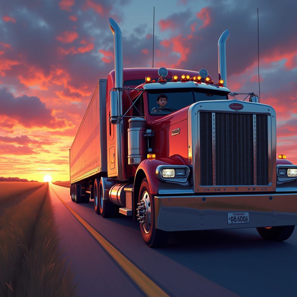 This image shows a semi-truck on a highway at sunset, with a young girl looking out the window. The scene is captured in a vibrant, cinematic style with dramatic lighting and a rich color palette.