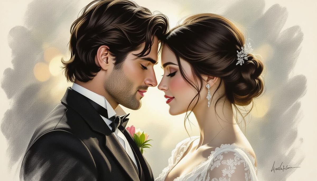 A hyperdetailed charcoal drawing captures two lovers in a romantic gaze and embrace. Soft lighting highlights their expressions, reminiscent of classical romantic portraiture with dramatic tonal depth.