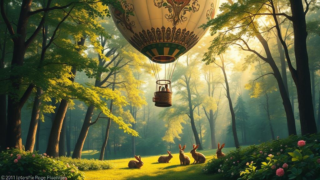 A vintage hot air balloon with Art Nouveau patterns floats over a forest. A hidden clearing reveals hares. Rendered in a soft, painterly Impressionist style with rich textures and warm, golden hour light.