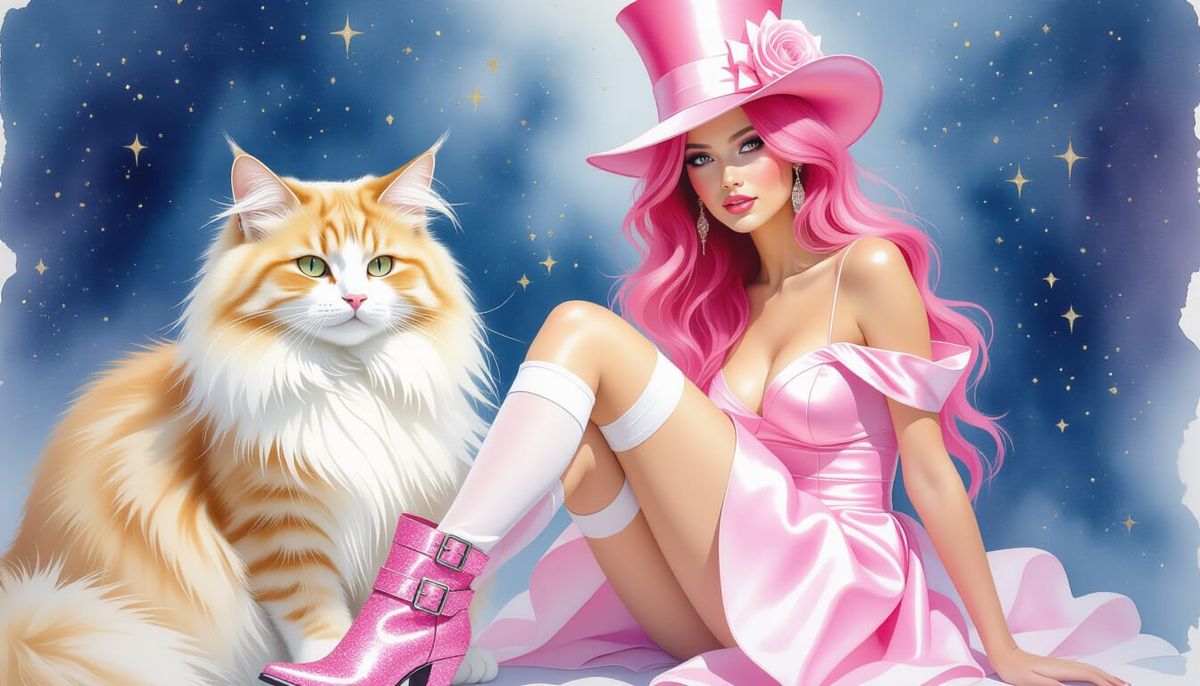 A striking picture of a woman with neon pink hair and a pink top hat, sitting beside a large tabby cat. Rabbits and cherry blossom trees fill the background in this watercolor art piece.