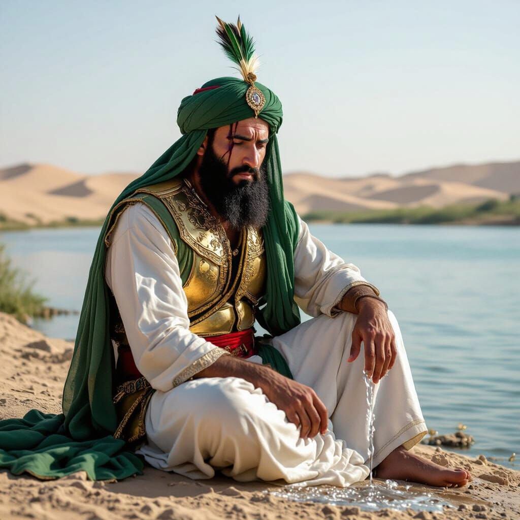 This image shows a noble warrior sitting by the Euphrates river in traditional Arab attire. The scene captures a blend of Persian and Islamic art, rich with intricate details and symbolism, in a divine aura.