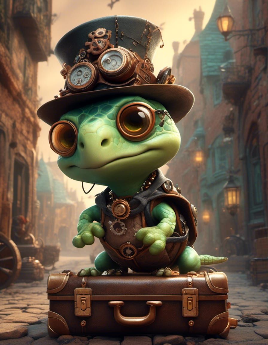 A striking picture of a steampunk turtle in a brick alley. The turtle has wide green eyes, wears tattered vintage clothing and a top hat, and sits on luggage amid gears and skulls in grunge style.