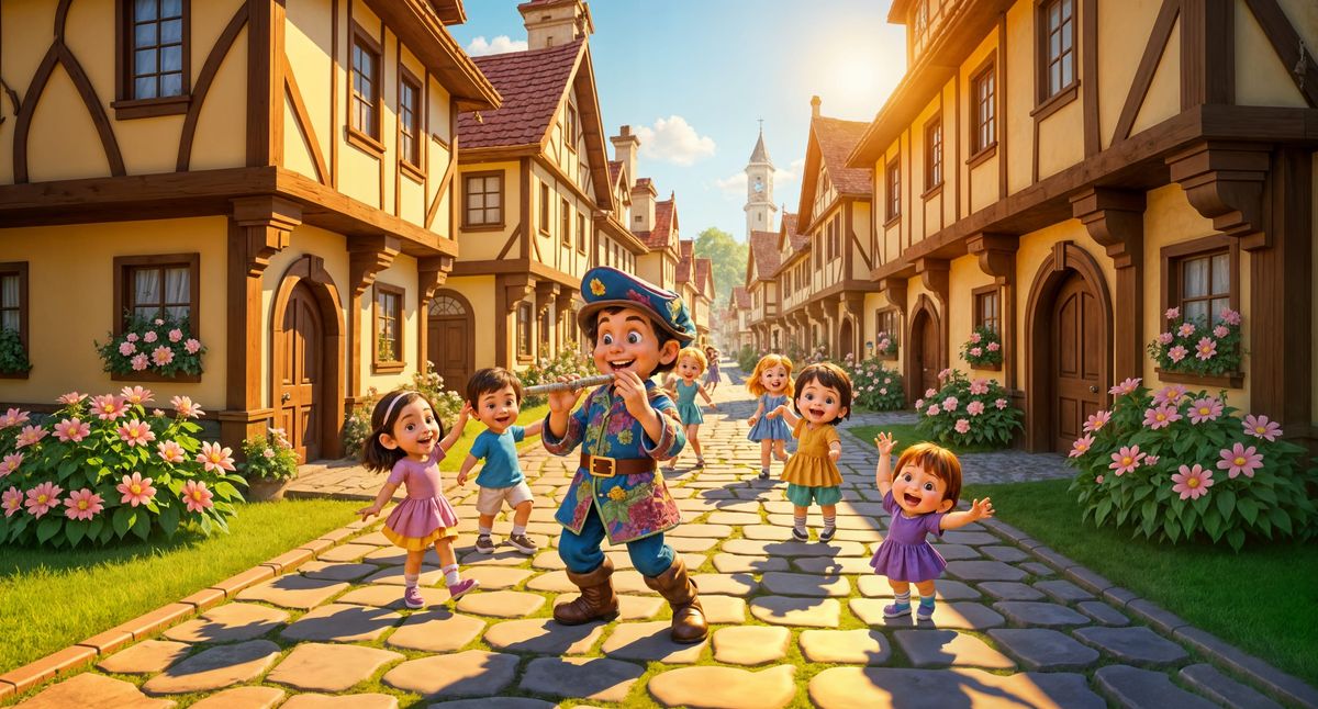 This image depicts a whimsical street scene in a fairy tale village. A colorful piper leads cheerful children down a cobblestone path past charming houses, bathed in warm morning light.