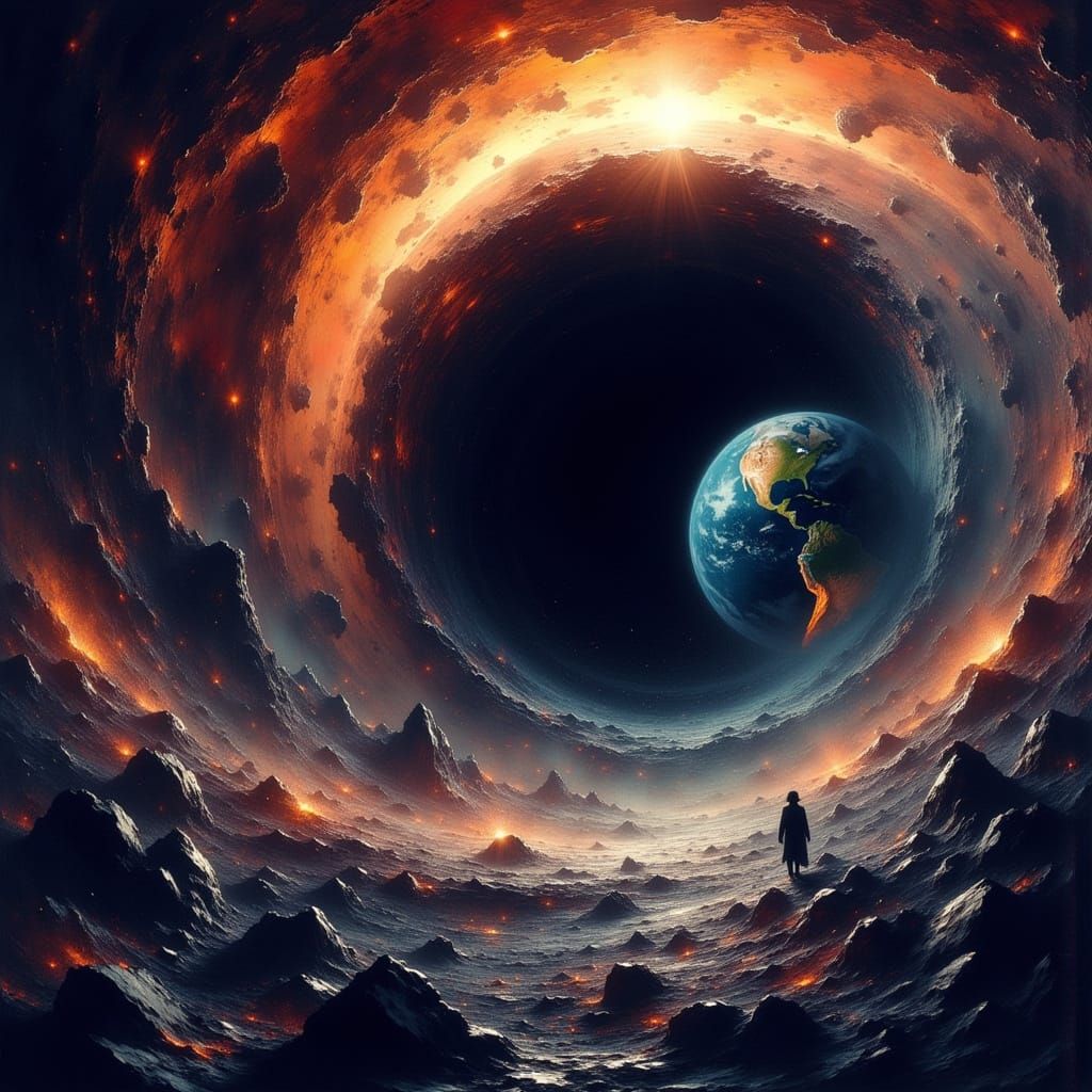 A hyperrealistic image of a massive black hole consuming a planet. Light bends dramatically around the singularity, creating shadows in the cosmic dust, in a morbid digital art style.