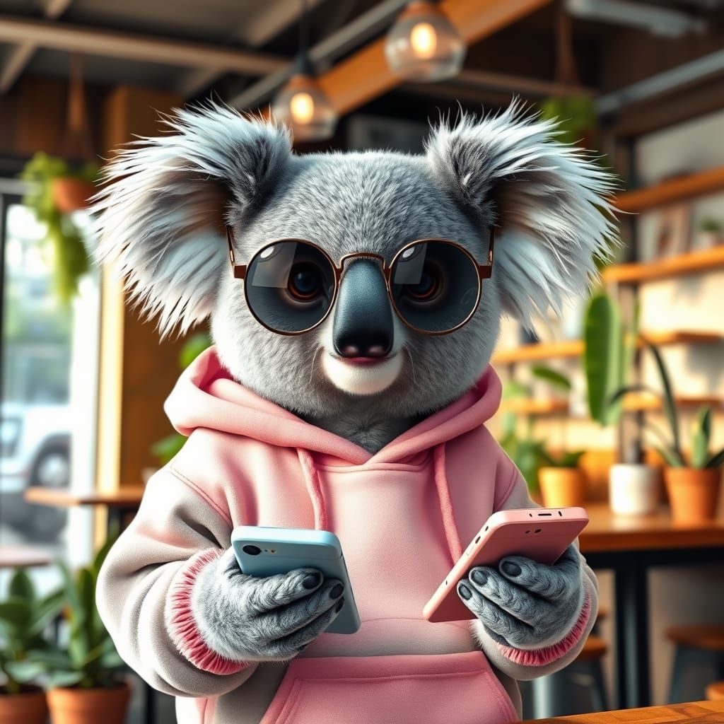 This image shows a cute koala wearing trendy streetwear and sunglasses in an urban cafe. The hyper-realistic digital artwork features soft natural light and textures, creating a playful influencer vibe.