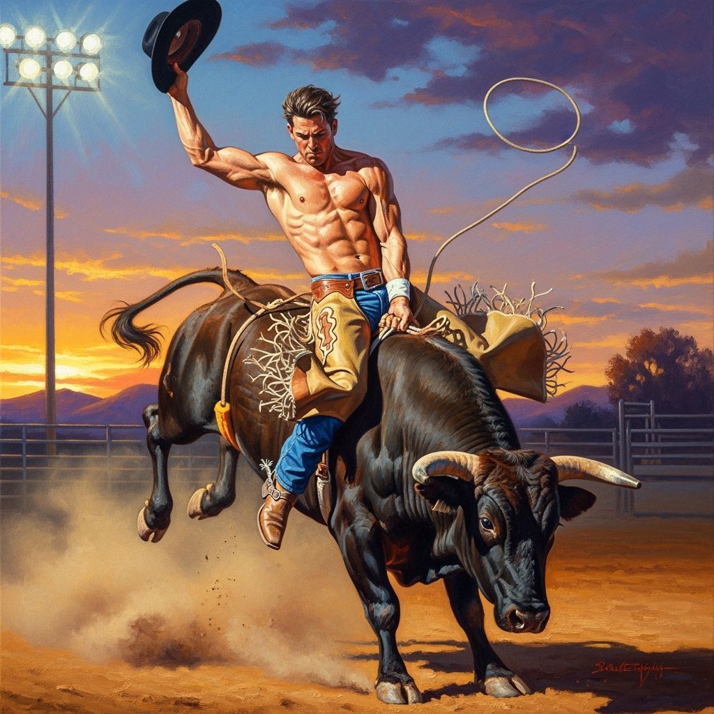 This vibrant oil painting depicts a muscular, shirtless cowboy expertly riding a powerful bucking bull. Thick impasto brushstrokes and dramatic lighting enhance the dynamic Western scene.