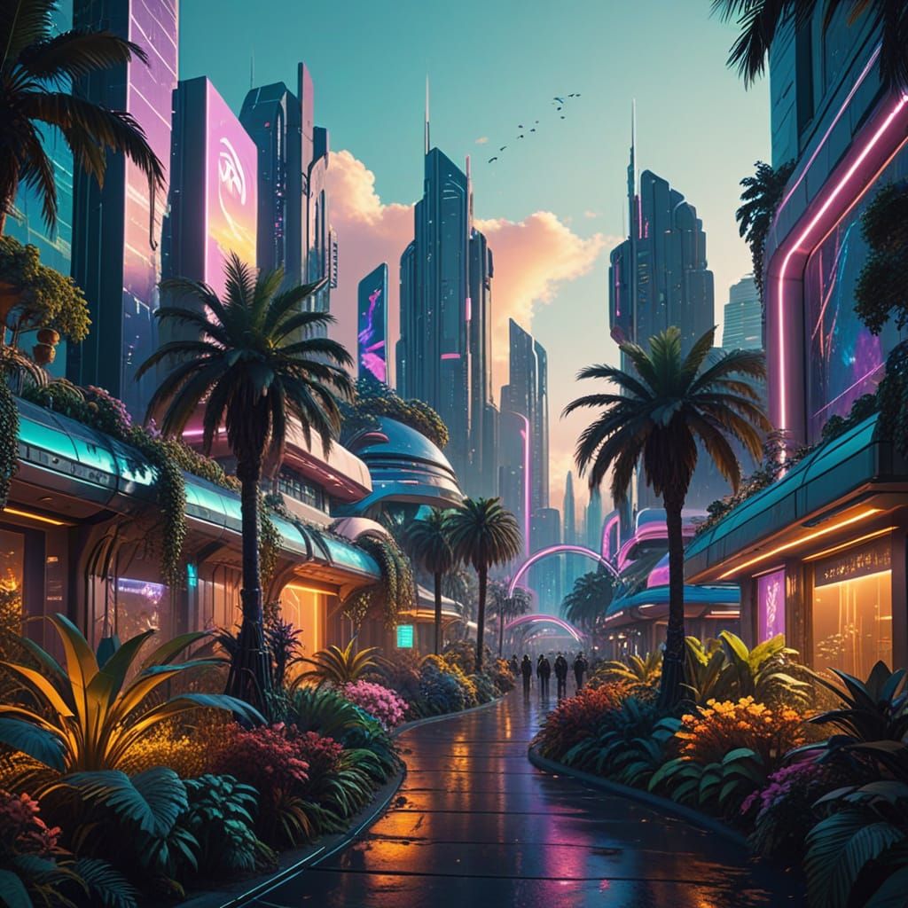 This image shows a breathtaking, utopian cityscape where nature and technology harmonize. A futuristic town square is surrounded by neon-lit buildings, lush gardens, and palm trees, creating a sense of wonder and magic.