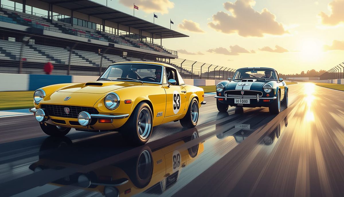 Two classic rally cars speed down Le Mans' Circuit de la Sarthe in early morning light. This dynamic image captures motion blur and wet pavement in a bold, vibrant comic book style.