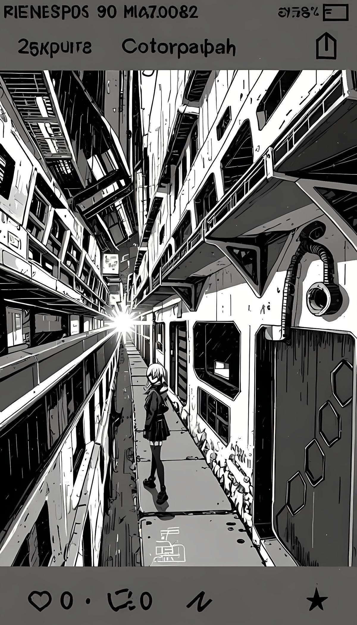 This image is a haunting blend of manga and cyberpunk elements, set against a dark and gritty futuristic cityscape with eerie neon lights and ominous shadows. A serious schoolgirl stands out in the midst of the chaos, her expression a reflection of the distorted reality that surrounds her.