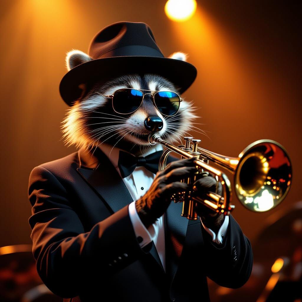 A raccoon dressed in a jazz suit, fedora, and sunglasses plays the trumpet under warm stage lights. The cinematic image has a film grain and vibrant color grading, in a cinematic aesthetic.