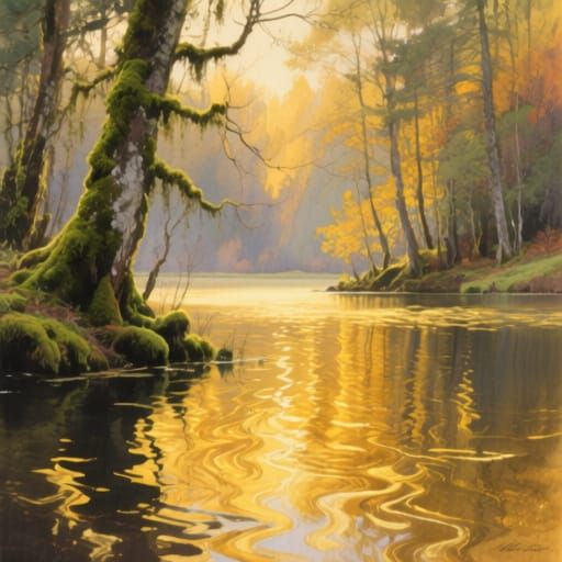 A tranquil forest lake filled with liquid gold, rendered with historical painterly realism and cinematic composition. Detailed textures and warm, contrasting colors evoke majestic grandeur.