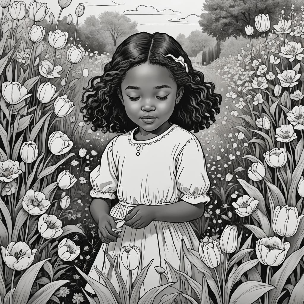 This image shows a black and white coloring book style illustration of a young black girl spinning in a flower garden while holding a tulip in her hand.