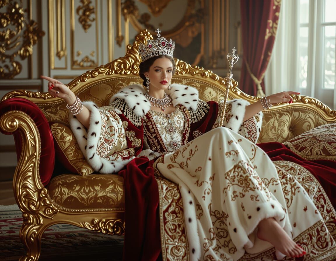 This image shows a Russian Tsarina relaxing on a chaise lounge, complete with coronation regalia and jewelry. Captured with a Canon lens, the image emphasizes natural lighting and sharp focus.