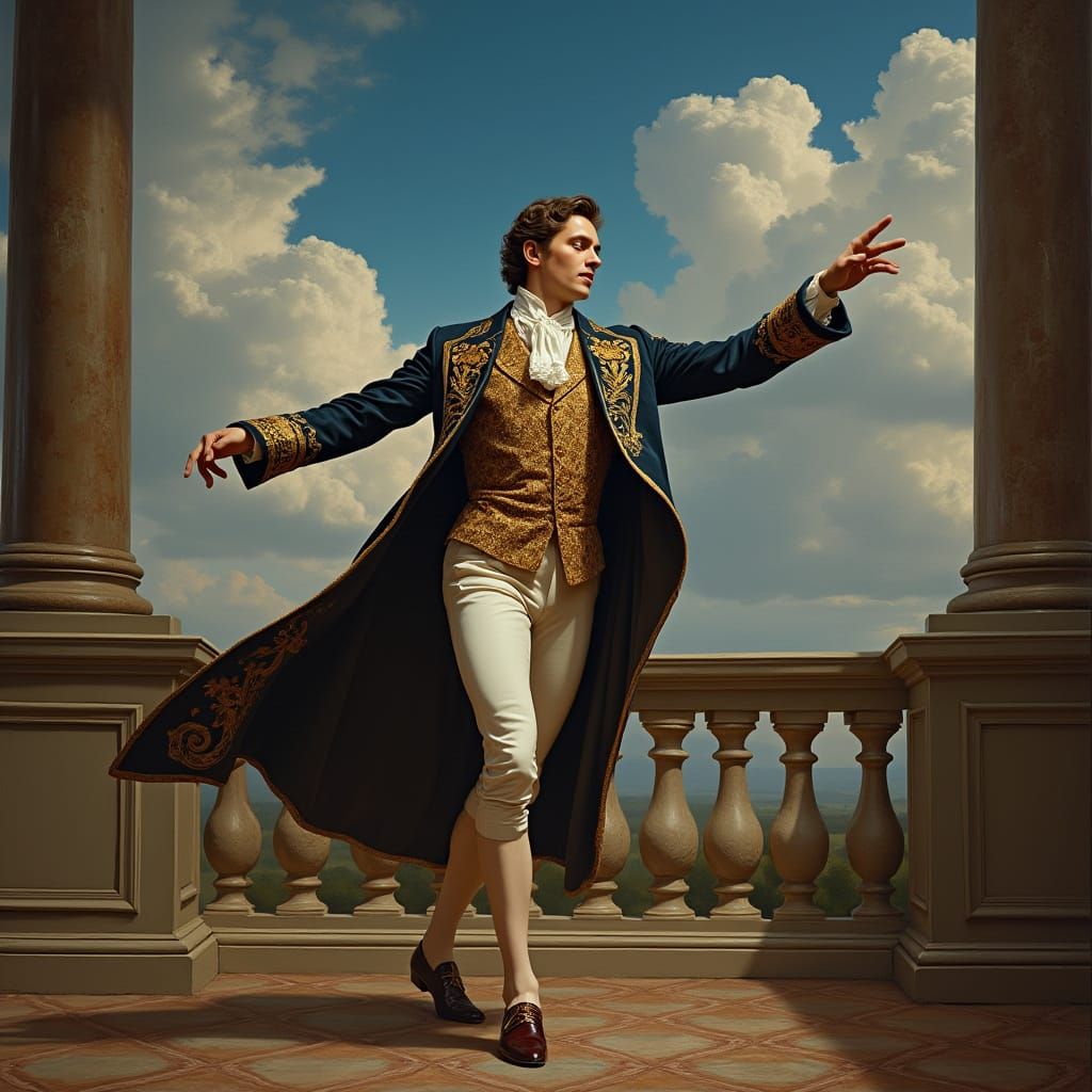 This image depicts a refined gentleman dancing in a lavish, 17th-century-inspired manor, set against a brilliant blue sky with puffy white clouds, and illuminated with dramatic chiaroscuro lighting.