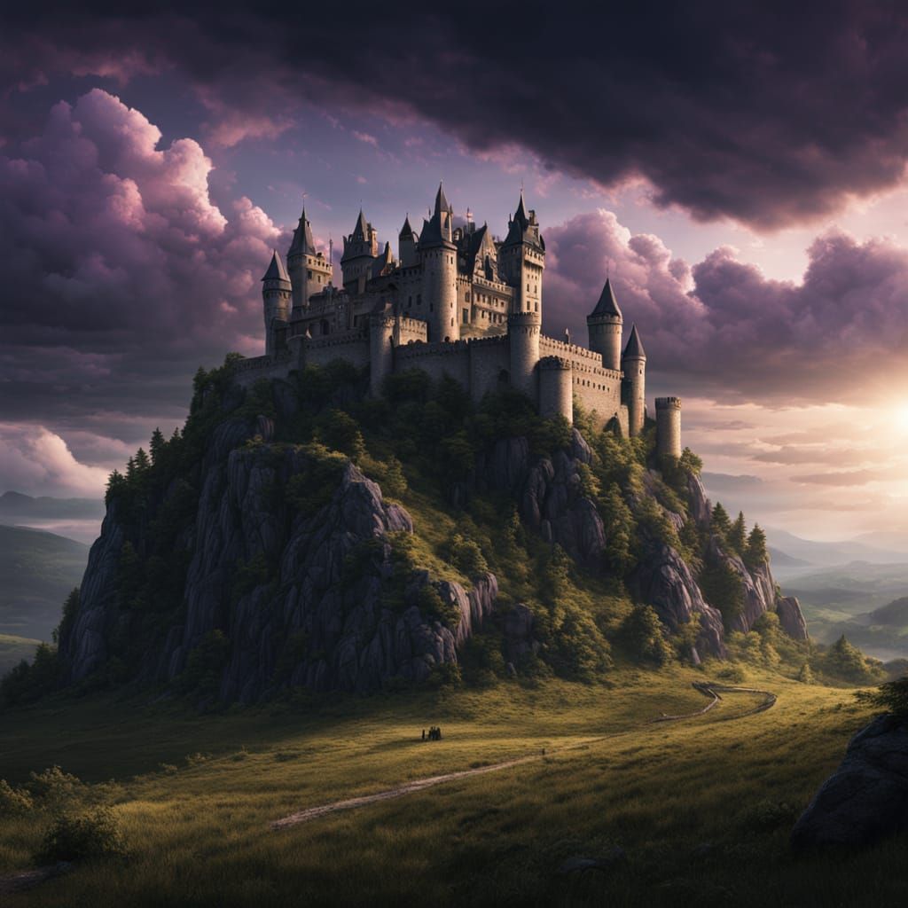 This image depicts a majestic castle set against a dramatic purple sky with sweeping vistas and grandeur, evoking a sense of mysticism and epic cinematic grandeur in a photorealistic style reminiscent of 2007 live action films.