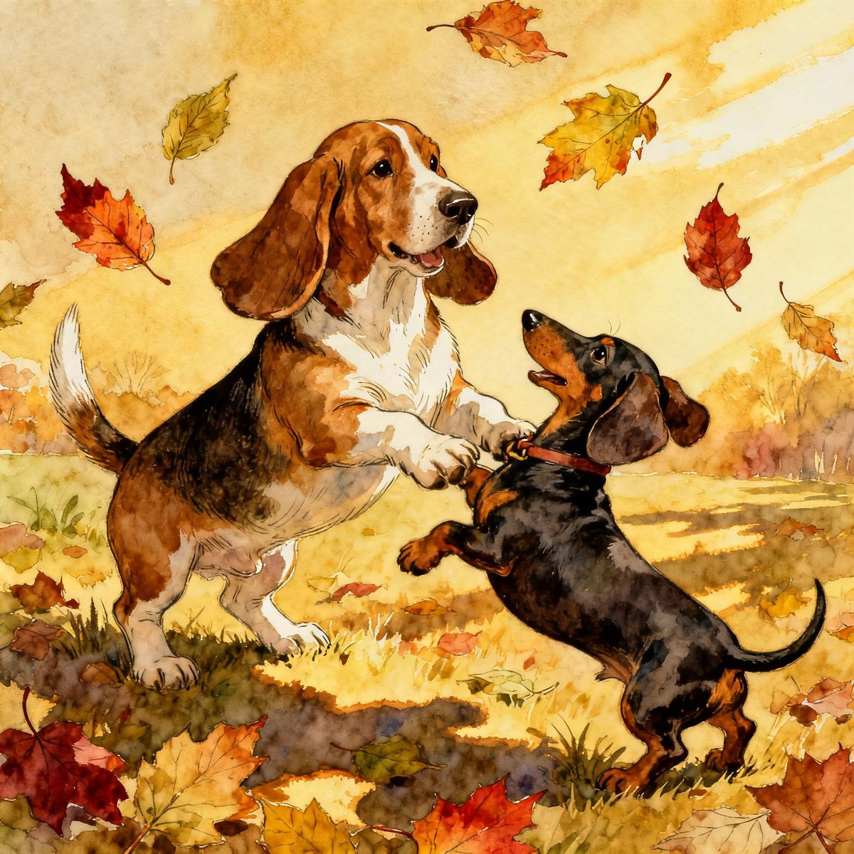 This image shows a Basset Hound and Dachshund in playful poses amidst falling autumn leaves. Rendered in a whimsical, storybook illustration style with watercolor textures.