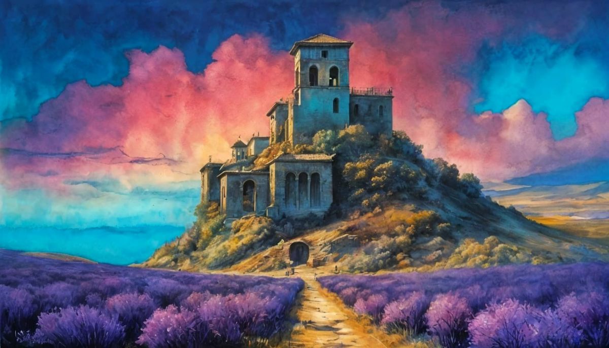 A surreal image of an abandoned Mediterranean house with a tower on a coastal hill. Lavender and wisteria bloom under a radiant turquoise sky. The image has graffiti art elements and deep color saturation.