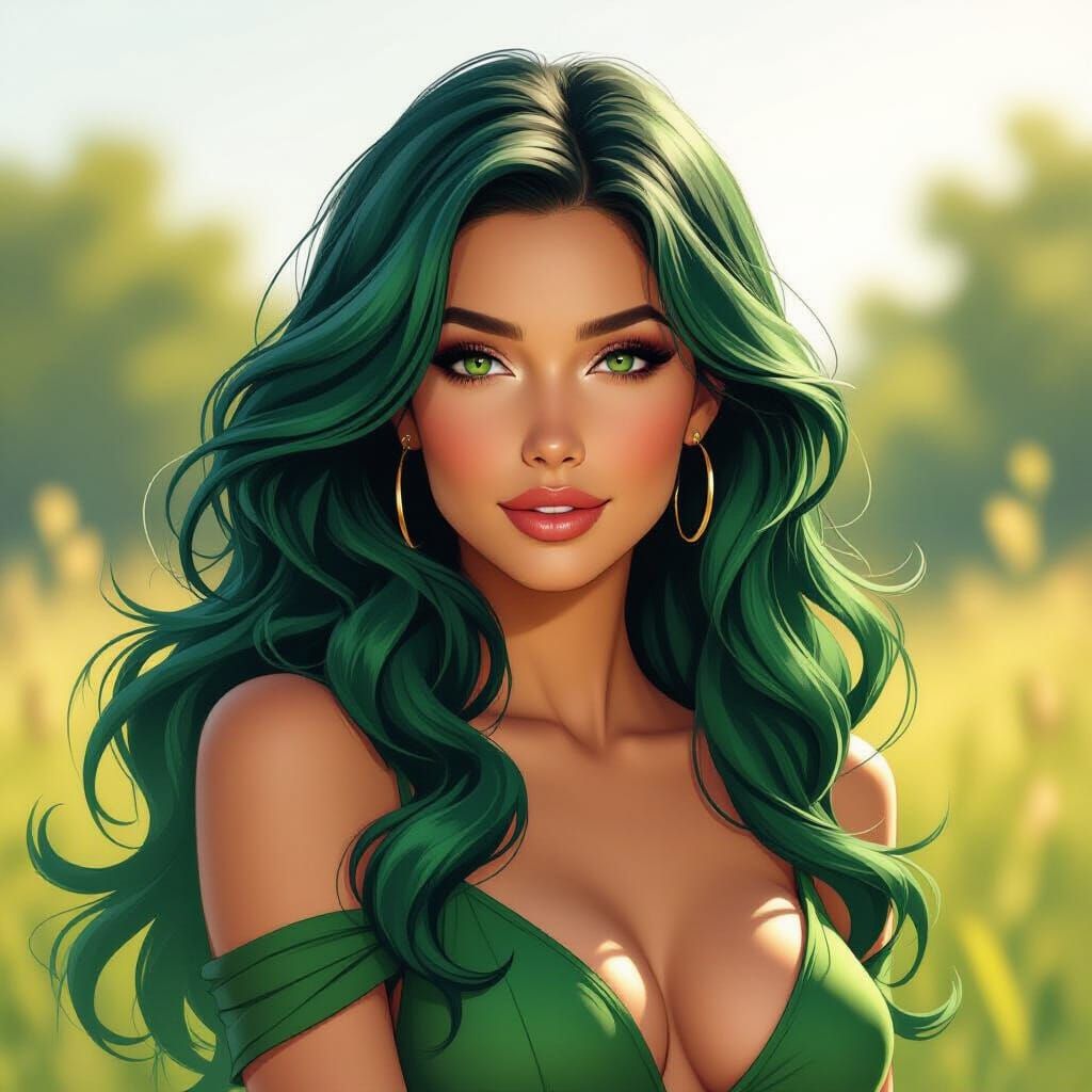 This image depicts a beautiful woman with vibrant green hair in a heroic comic book style. Dappled sunlight illuminates her form against a softly blurred natural landscape with rich, saturated colors.