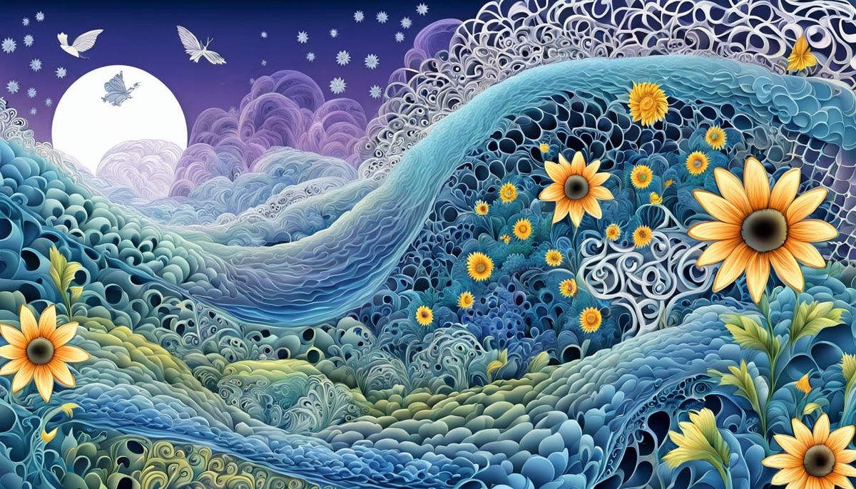 A detailed fantasy illustration of a fairy observing woodland creatures and vibrant flora. The image features a mix of flowers, berries, and mist, rendered with ethereal, hyperdetailed styling.