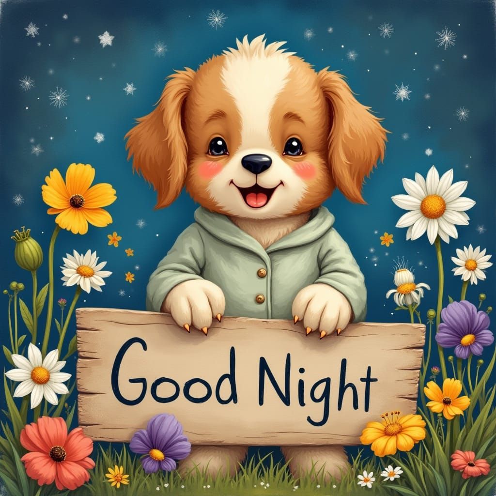 This image shows a happy puppy wearing pajamas next to a sign that reads "Good Night". The scene is filled with various flowers, including daisies and poppies.