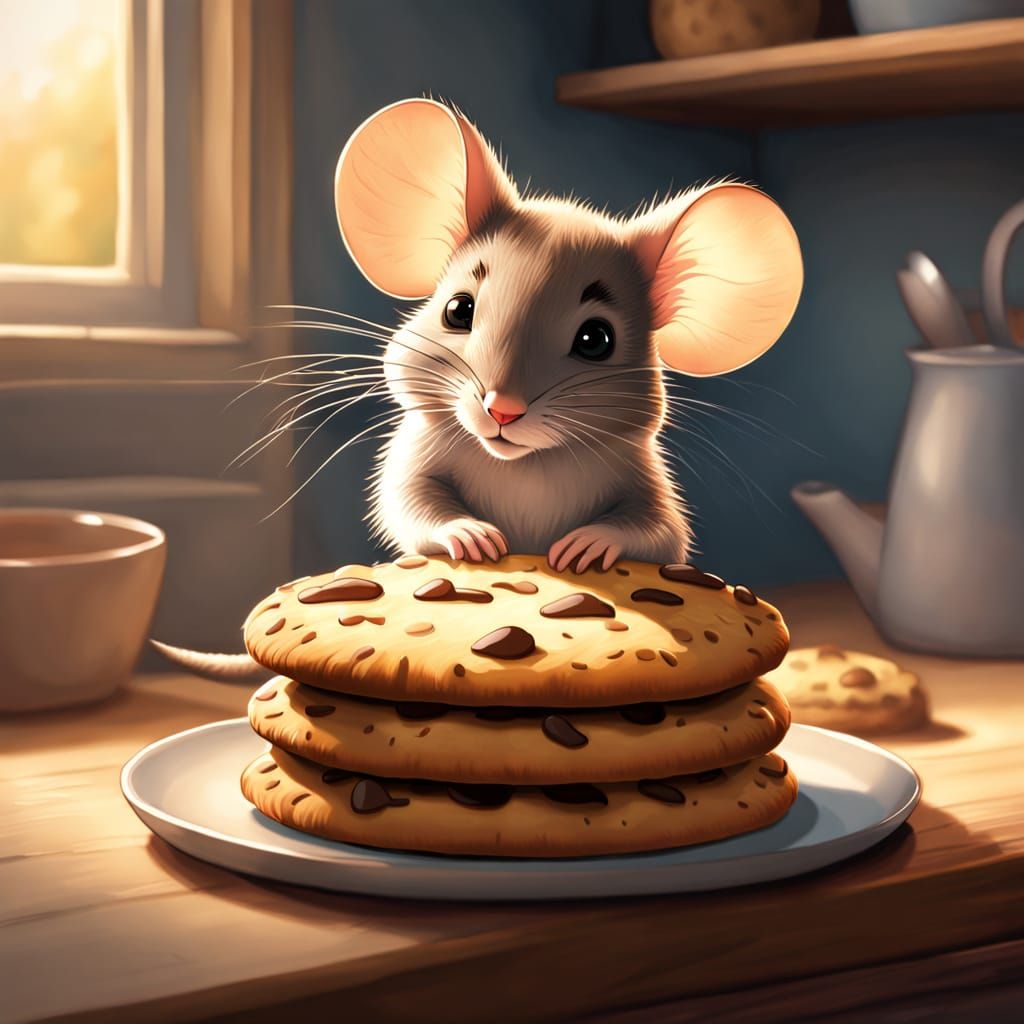 A charming children's book illustration of a timid mouse hiding behind a huge cookie in a sunlit kitchen. Rendered in soft watercolor style with a pastel color palette.