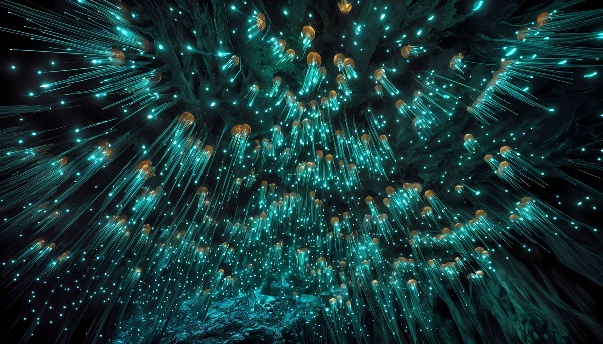 The ceilings come alive with thousands of glow worms in the Te Anau Glow Worm Cave in Waitomo, New Zealand