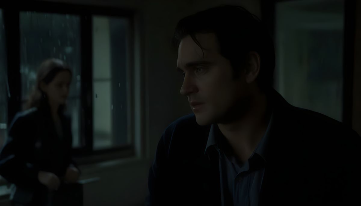 A cinematic shot of a man staring out a window in the rain with a resigned expression. In the background, a woman leaves the house with luggage, adding to the scene's emotion.