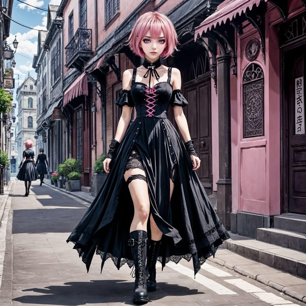 "Anime pink short hair woman, wearing a gothic long dress with laces, gothic boots, walking in the street"