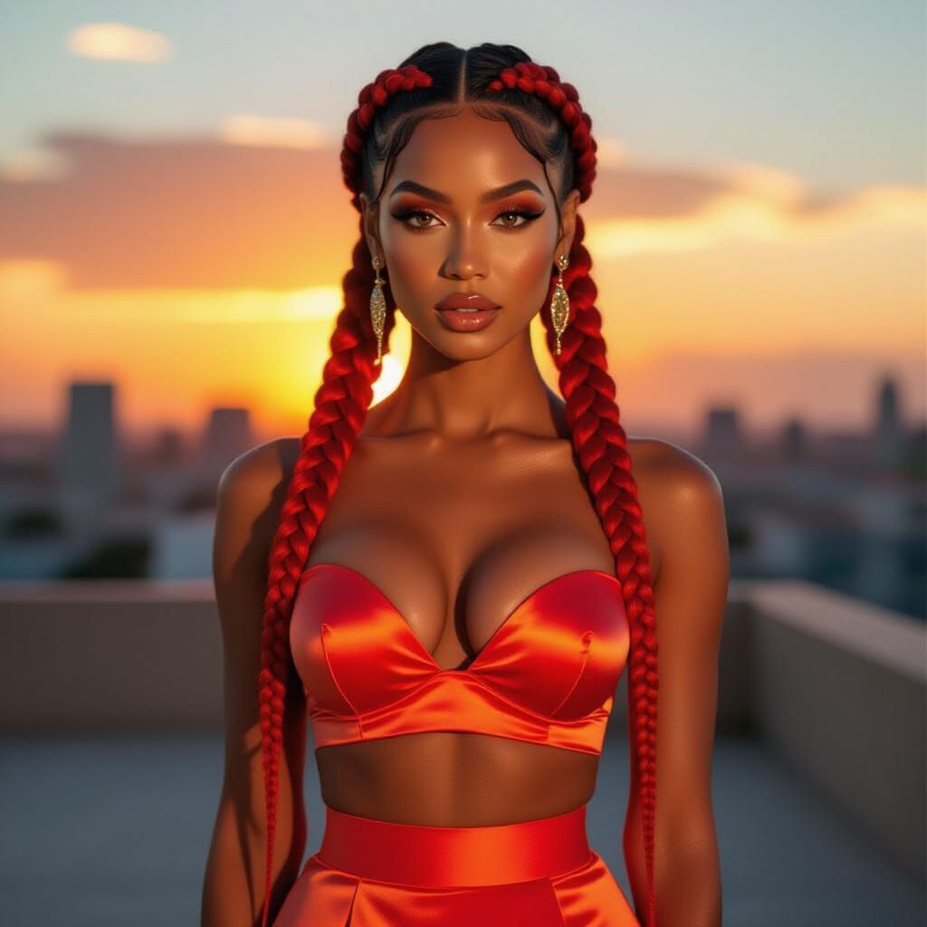 This image captures a radiant Black woman with luminous skin and striking ombre braids. She poses on a rooftop at sunset, exuding a fashion-forward vibe with cinematic lighting.
