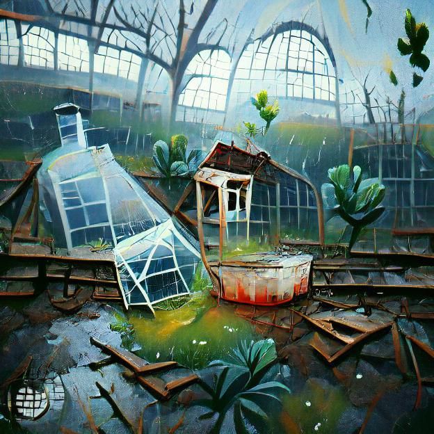 This image shows a dilapidated greenhouse overtaken by nature. The photo captures the serene decay, with plants reclaiming the structure in a peaceful, post-apocalyptic scene.