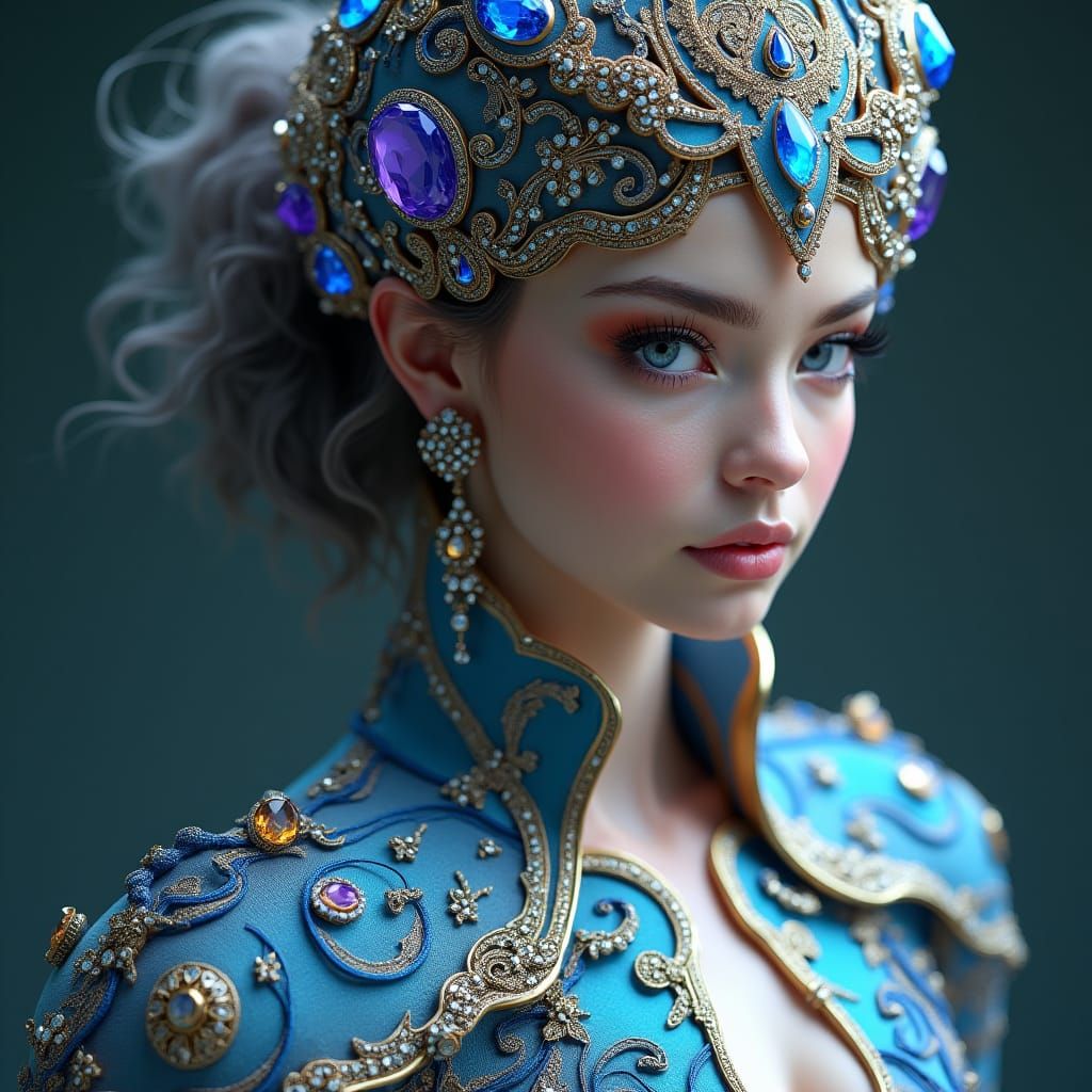 A hyperrealistic portrait of a woman with an ethereal glow. Her iridescent clothing features swirling patterns and gemstone jewelry, blending traditional and futuristic styles. The image has rich colors and nuanced shading, reminiscent of digital matte painting.
