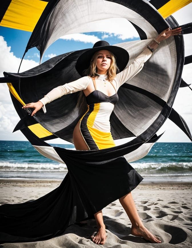 This image shows a woman wearing an oversized hat on a beach, rendered in a smooth, textured, suprematist art style with a fisheye perspective.