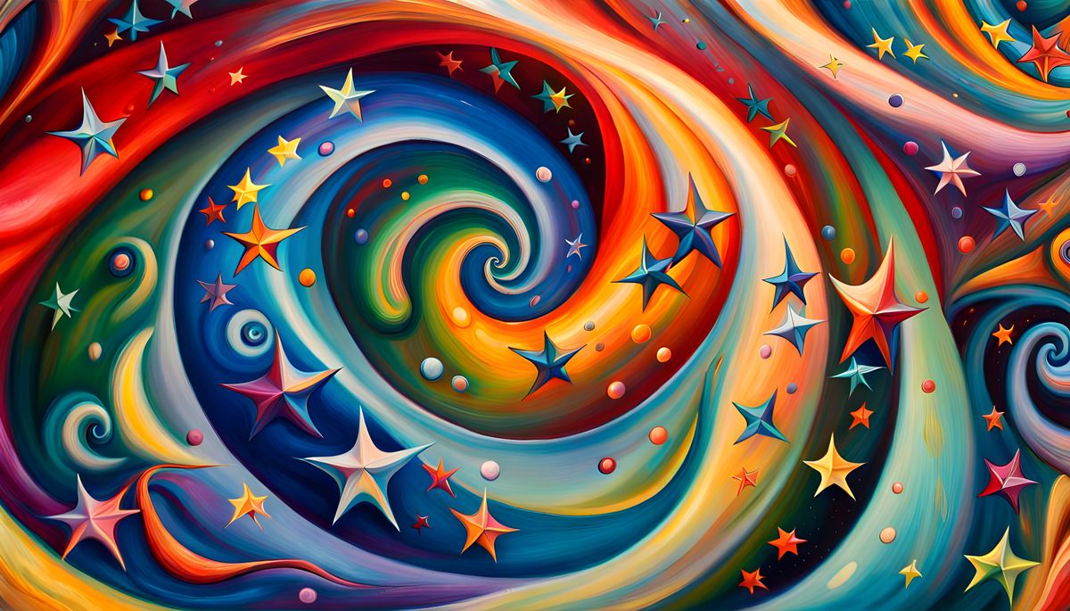 A vibrant image of a helical stellar vortex in deep 3D. The artwork shows swirling, spiraling stars with exaggerated colors, reminiscent of a Marc Chagall oil painting with impasto textures.