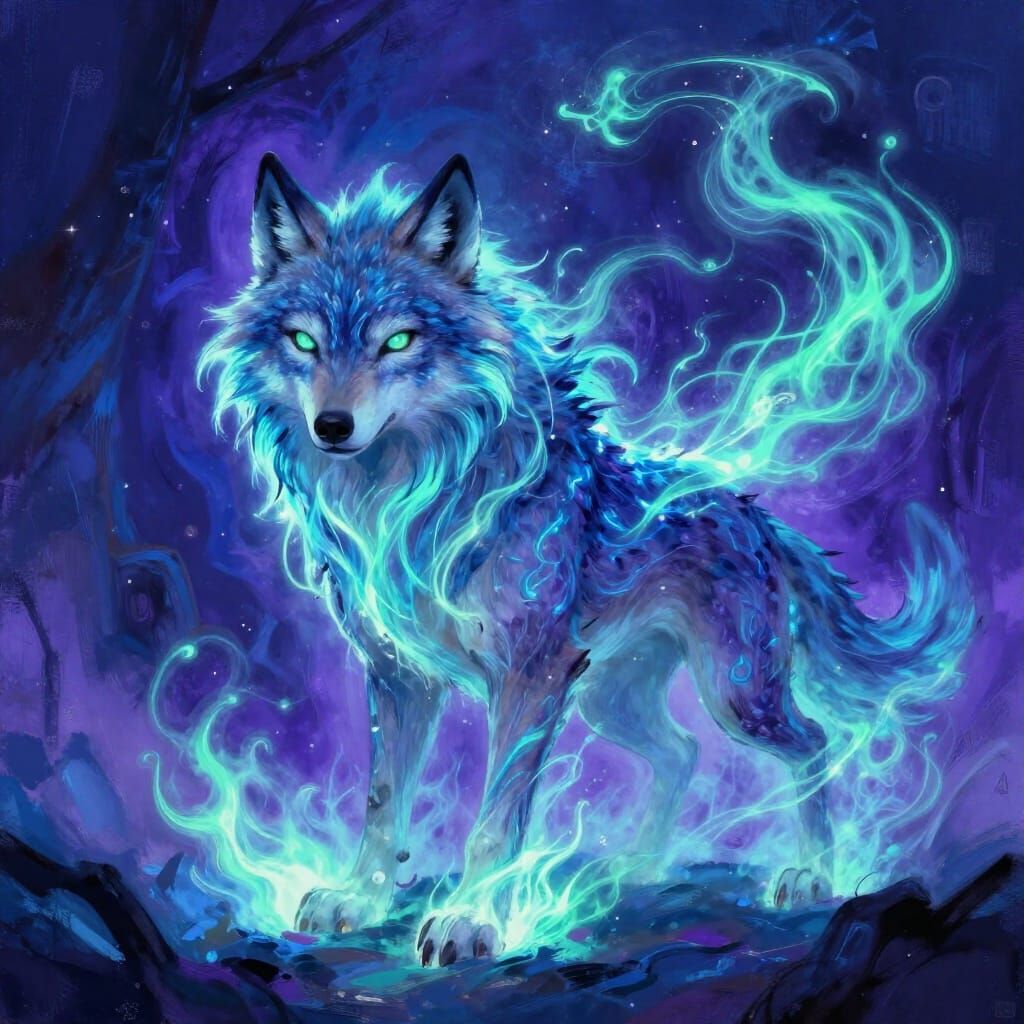This image shows a mystical wolf-like creature with swirling energy, blending nature and spirit. Rendered in a high-contrast digital painting with cool colors and dynamic lighting.