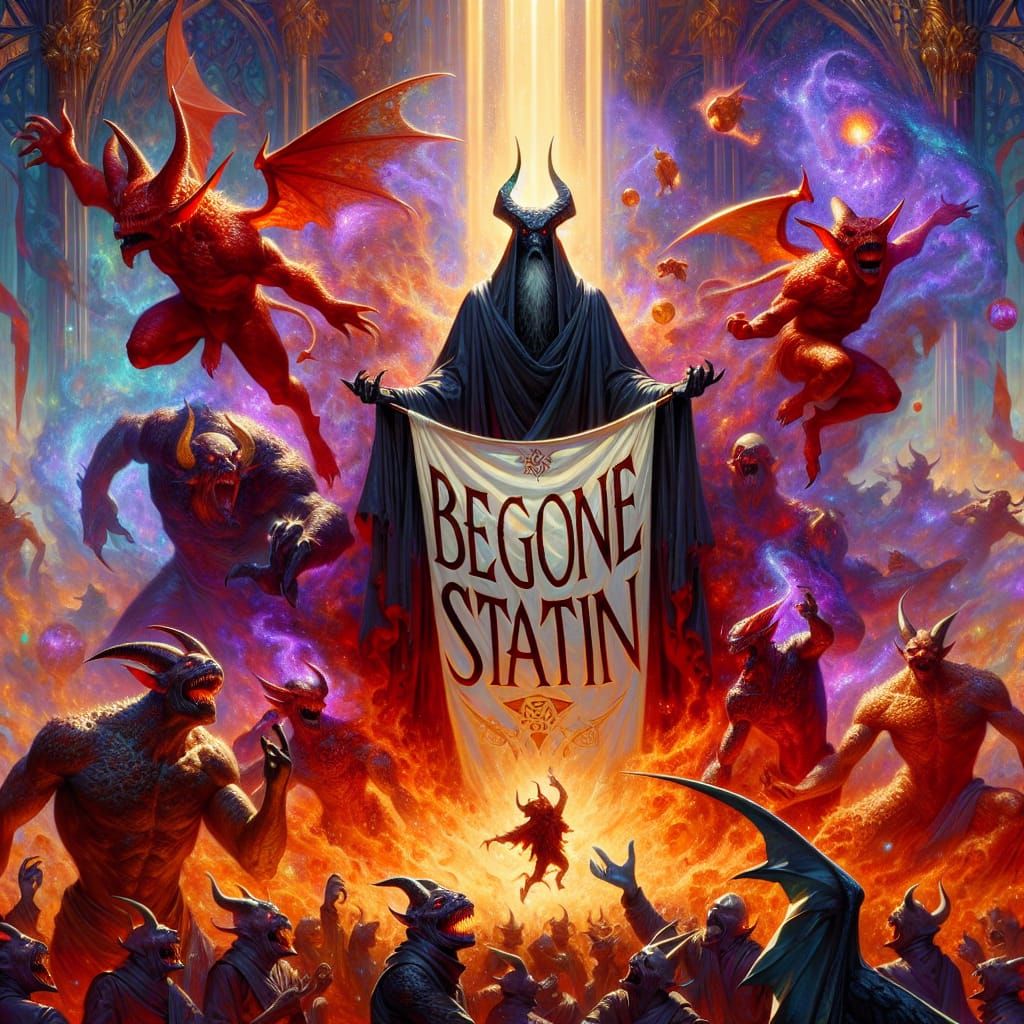 Illustrate a fantasy concept art scene in an 8k resolution. The center of the composition is a morose demonic creature of a charcoal-black color, holding up a banner with the phrase, 'BEGONE SATIN' written on it in fiery letters. Surrounding this central figure, incorporate several other demons in various ...