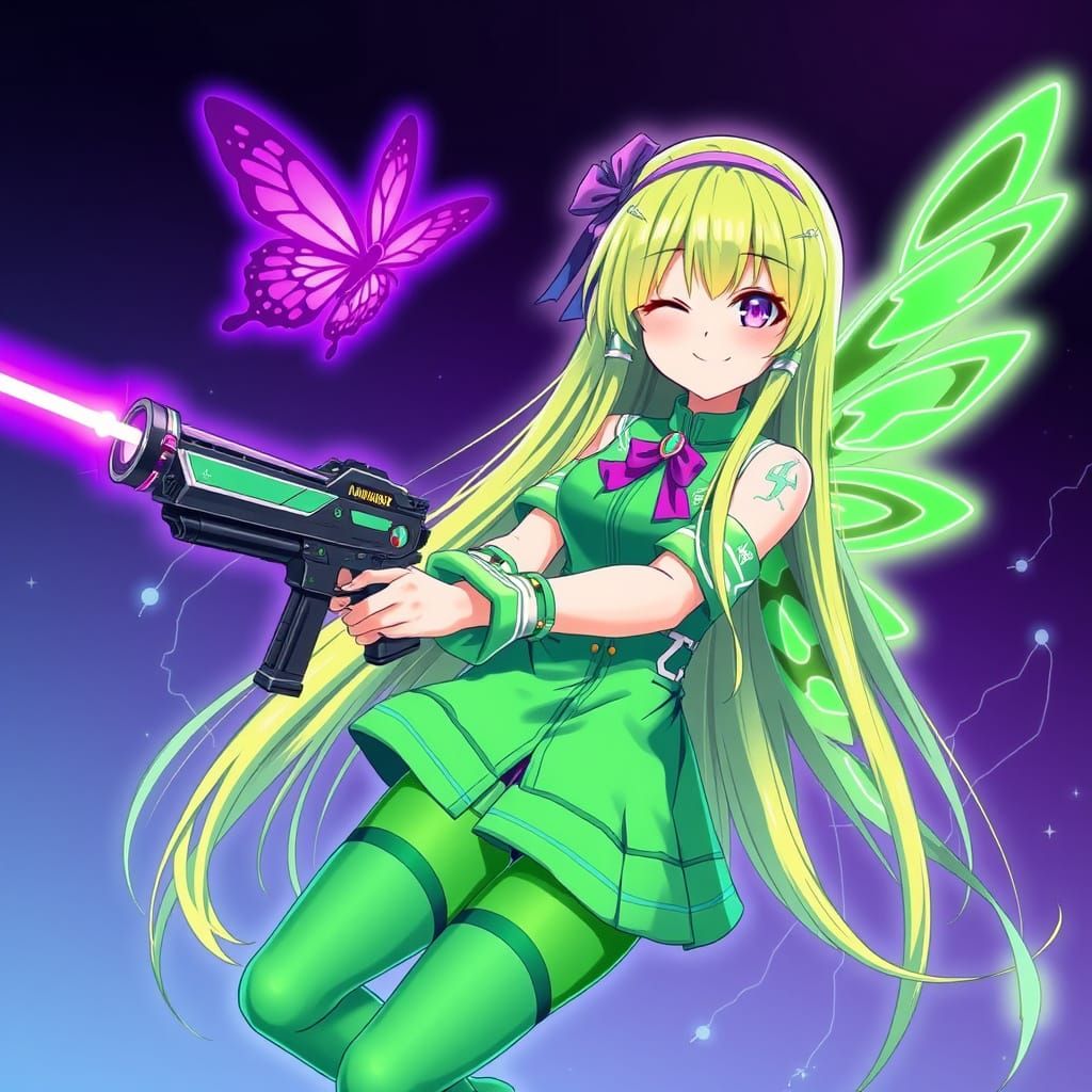 This image shows a vibrant, neon-lit anime girl with electric wings and a lasergun, under the control of a majestic purple butterfly, set in a cyberpunk world with a mix of futuristic and fantasy elements.