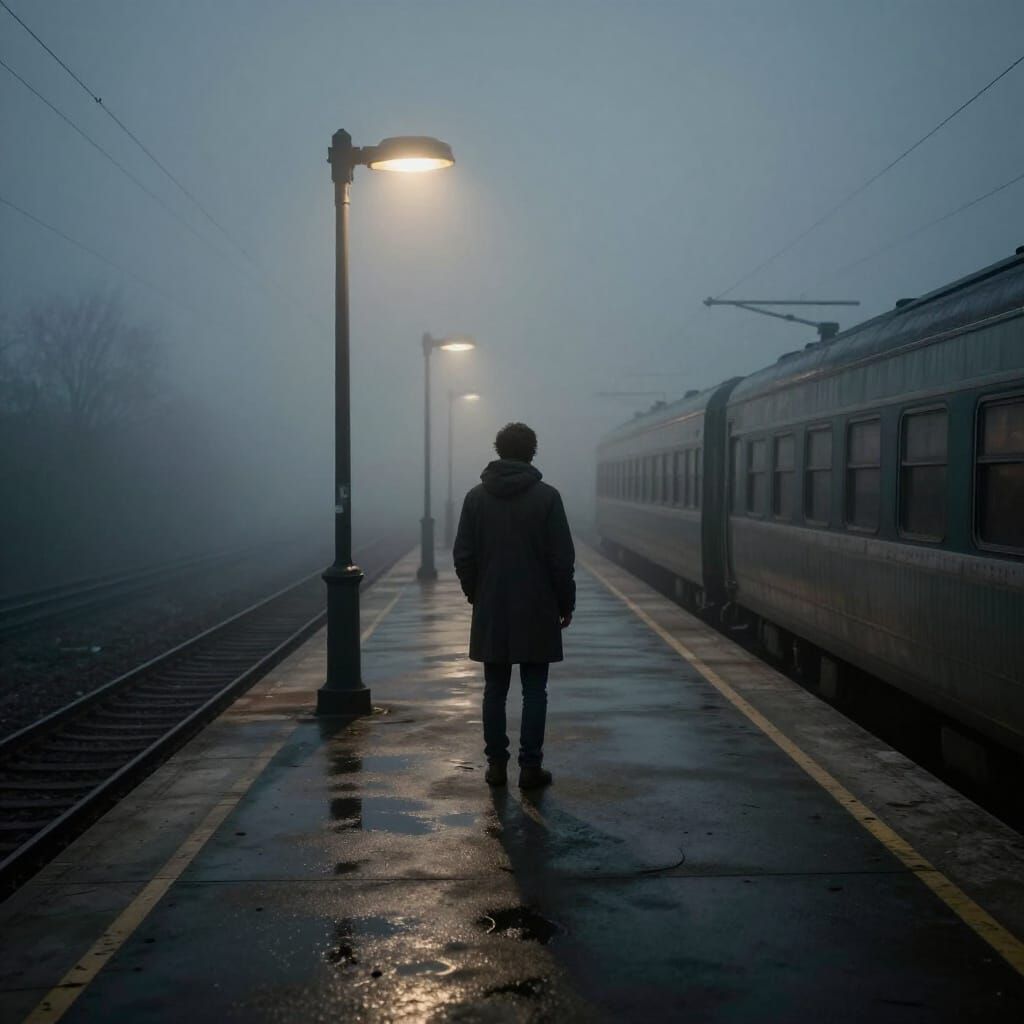 This image depicts a lone person on an empty train platform at dawn, enveloped in mist. A single lamp creates dramatic shadows in a gritty, noir style with muted colors.