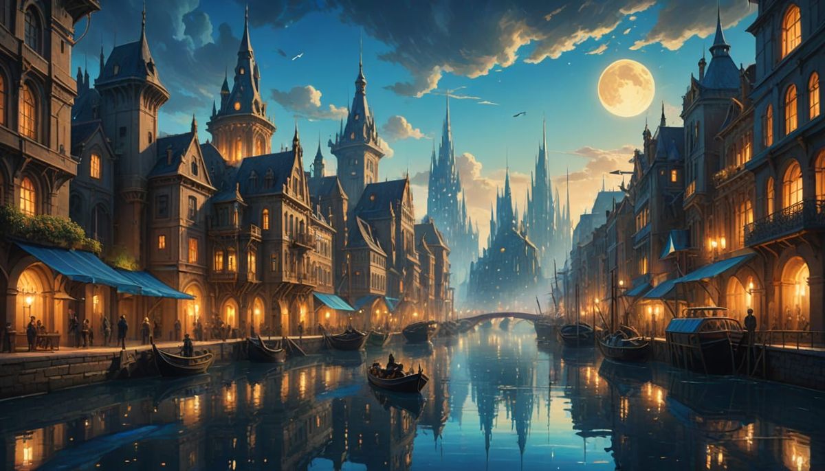 A masterpiece oil painting captures a futuristic city with glowing towers and flying ships. Reflections shimmer in water canals, blending warm golden and cool blue light with cinematic detail.