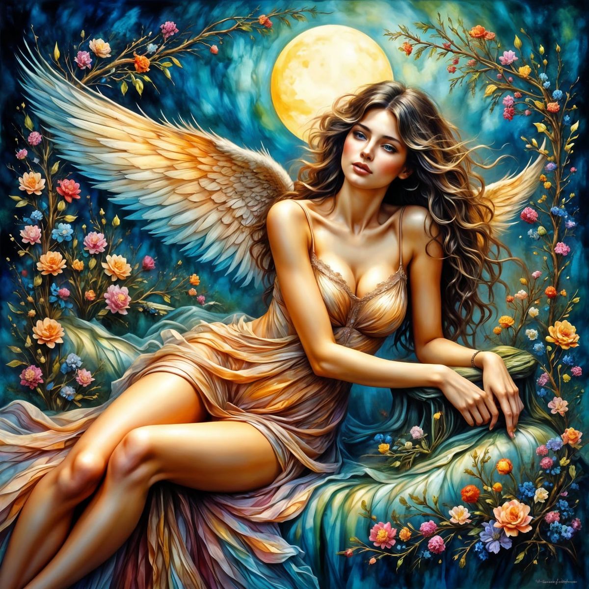A beautiful woman lies in the back of a Chevy Van, surrounded by the soft glow of moonlight. Her long legs and tanned skin are depicted in a neo-impressionist oil painting style, with thick layers of textured paint creating a unique and dreamy atmosphere.