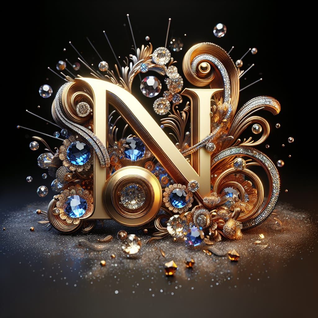 This image shows a luxurious 3D logo design for a jewelry company, featuring the letters 'NA'. The logo is crafted in shiny gold, encrusted with gems, and rendered with hyper-realistic detail as 3d digital art.