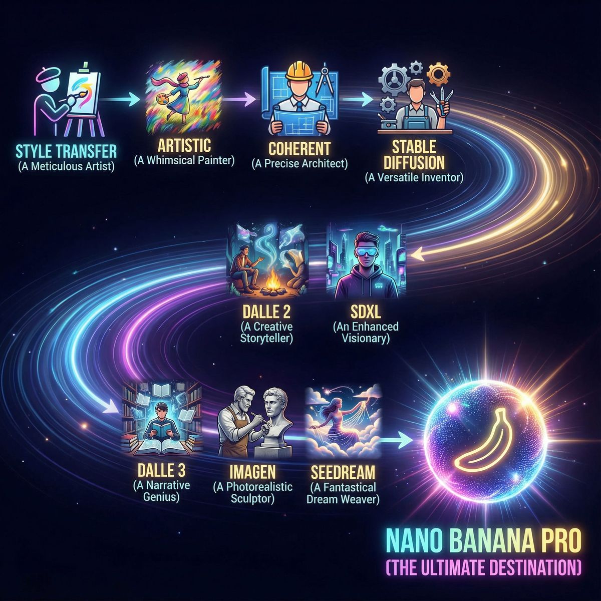 This infographic visually charts the progression of AI image generation models, from early style transfer to advanced narrative and photorealistic capabilities, culminating in a dazzling, dreamlike display.